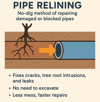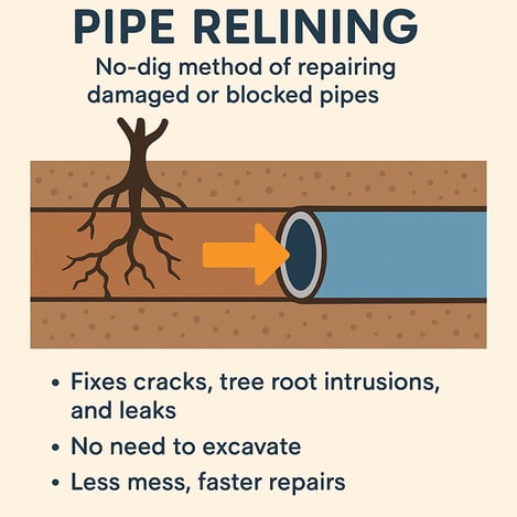 A no-dig method of repairing damaged or blocked pipes by inserting a new, durable lining inside the existing pipe. It fixes common problems like cracks, tree root intrusions, and leaks without the need to dig. This means less mess, faster repairs, and long-lasting results that save homeowners time and stress.